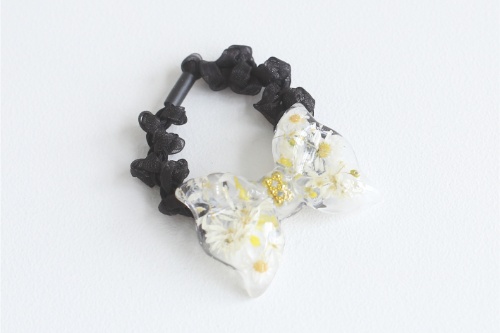 透明感のあるレジンに、お花をいれた存在感のあるリボンのヘアゴムです!ヘアアレンジにはもちろん、手につけててもオシャレです!